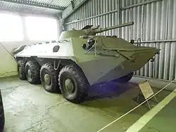 The BTR-70 is an eight-wheeled armored personnel carrier (Russian: бронетранспортер/Bronetransporter, or literally "Armoured Transporter") originally developed by the Soviet Union during the late 1960s under the manufacturing code GAZ-4905. On August 21, 1972, it was accepted into Soviet service and would later be widely exported. Large quantities were also produced under license in Romania as the TAB-77.[1]