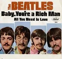 "Baby, You're a Rich Man" was initially submitted for inclusion in Yellow Submarine.[31][67] While parts of the song were used in the film, its initial release was as the B-side of "All You Need Is Love",[68] which the Beatles performed on the Our World satellite broadcast on 25 June 1967[69] and then rush-released as a single.[70][71] The release took place on 7 July in the United Kingdom and on 17 July in the United States.[72][73] "All You Need Is Love" topped singles charts in many countries around the world.[71] In the United States, the B-side also charted in its own right, peaking at number 34 on the Billboard Hot 100[74] and number 60 on the Cash Box Top 100.[75] In Australia, it was listed with "All You Need Is Love", as a double A-side, when the single topped the Go-Set national chart.[76]