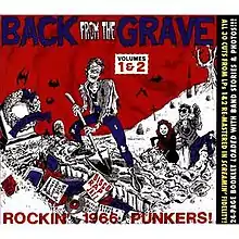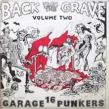 Back from the Grave, Volume 2 is the second installment in the Back from the Grave series of garage rock compilations put together by Tim Warren of Crypt Records on LP.[1][2] It was released in 1983.[2] In keeping with all of the entries in the series, and as indicated in the subheading which reads "16 Garage Punkers," this collection consists of songs which display the rawer and more aggressive side of the genre and are often characterized by the use of fuzztone-distorted guitars and rough vocals.[1][3] The set generally excludes psychedelic, folk rock, and pop-influenced material in favor of basic primitive rock and roll.[1][3] The packaging features well-researched liner notes written by Tim Warren which convey basic information about each song and group, such as origin, recording date, and biographical sketches, usually written in a conversational style that includes occasional slang, anecdotes, humorous asides.[3] The liner notes are noticeably opinionated, sometimes engaging in tongue-in-cheek insults directed at other genres of music.[3] The packaging also includes photographs of the bands, and the front cover features a highly satirical cartoon by Mort Todd depicting revivified "rock and roll" zombies who have just emerged from the grave to "burn on a skewer" all adherents of supposedly heretical pop and progressive music which have come to prominence over the years, such as disco.[3]