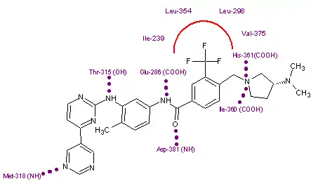 Imatinib was the first Bcr-Abl tyrosine-kinase inhibitor and was highly successful in treatment of chronic myelogenous leukemia, which had previous had no effective treatment. With the emerging resistance to imatinib treatment, alternative treatment was highly sought after. Bafetinib was created as an attempt for a more potent drug than imatinib, with efficacy against various point mutations in the Bcr-Abl kinase, with fewer adverse effects and with narrower kinase spectra, namely just Lyn and Bcr-Abl.[2] In the search for a substance that fit the criteria mentioned, the crystal structure of imatinib bound to Abl was examined. This revealed a hydrophobic pocket around the phenyl ring adjacent to the piperazinylmethyl group of imatinib. Attempts to utilize this pocket to increase efficacy led to the addition of various hydrophobic groups including single fluoro, bromo and chloro substituents. Finally a trifluoromethyl group at position 3 was found to give the best results, with approximately 36-fold improvement over imatinib. The addition of a hydrophobic group now needed to be countered to sustain the solubility of the substance. Closer examination of the crystal structure of imatinib-kinase complex revealed Tyr-236 was in close proximity to the pyridine ring of imatinib, suggesting there was little or no room for a larger group there. With that in mind a more hydrophilic pyrimidine ring was substituted for the pyridine, which was found to increase solubility while leaving efficacy the same or even slightly greater. Finally to improve the hydrogen bonding of the piperazine ring of imatinib with Ile-360 and His-361, pyrrolidine and azetidine derivatives were introduced. The most promising substance from these final modifications was labeled NS-187.[3]