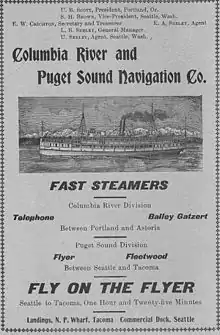 In 1903, the Columbia River & Puget Sound Navigation Company merged with The Dalles, Astoria & Portland Navigation Company, also known as the Regulator Line.[57] This gave rise to "the most spectacular period of rivalry on the lower river" between Captain Scott's boats, the Gatzert and Telephone, the Oregon Railway and Navigation Company's Hassalo and T.J. Potter, and the independent steamer Charles R. Spencer, owned by Capt. Ernest W. Spencer. (1852-1930).[57][58]