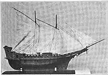 Bajak is a type of sailing prahu of the Dayak people of Borneo. It is propelled by both sail and oars. The bajak has a sharp but hollow bow, with projection at top. It has large square stern which projects at the sides of the hull and supported by two strong beams. On the side of the vessel are projecting open galleries for oarsmen.[1] Bajak has two mast with lug rig, and a bowsprit which support headsails (fore staysail and jib). The sail of bajak is made of cotton.[2] It has a large deckhouse between the foremast and mainmast, a hatchway is present abaft the mainmast.[1] The name may have originated from Malay word bajak means "plow", or membajak, "to plow".[3] This prahu may have been used by Sea Dayak for use in piracy owing to its double type of propulsion (sail and oar) which is very common amongst pirate prahu of the region, and may have influenced the Javanese word bajak, which means hijack or piracy. Javanese word bajak laut means sea pirate.[4]
