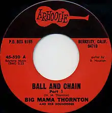 In 1968, Arhoolie Records released "Ball and Chain".[5] An edited version, titled "Ball and Chain Part 1" was released as a single, while the complete four and a half minute song is included on a joint album by Thornton, Lightnin' Hopkins, and Larry Williams titled Ball and Chain.[6] Thornton is backed by a small combo with her frequent guitar accompanist Edward "Bee" Houston.[7] She later recorded several live and studio performances of the song, included her 1969 Billboard Top 200 album Stronger Than Dirt.[8]