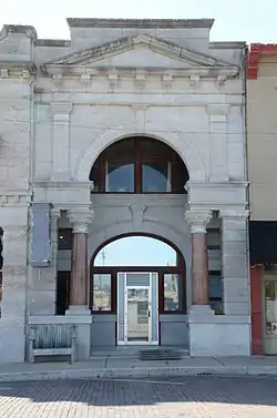 The Bank of Rogers Building is a historic commercial building at 114 South 1st Street in Rogers, Arkansas. It is an elegant two story Renaissance Revival structure with a limestone front. There are essentially two facades, one of which is set back under a large Roman arch, which forms the major element of the outer facade. This arch begins on the first level with square outer pillers and round inner ones, and is flanked on the second level by marble pilasters, which rise to support a projecting entablature and pediment. The inner facade has the main entrance under a segmented arch, with a pair of sash windows under a round arch on the second level.[2]