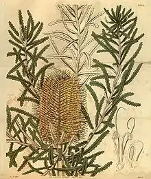 B. spinulosa var. collina was first published as Banksia collina by Robert Brown in 1810, based on specimens he found among hills in the vicinity of the Hunter River, New South Wales in New South Wales in 1802.[1][3] Brown did not give an explicit reason for the specific epithet "collina", but it is universally accepted that it is from the Latin collinus ("of hills"), in reference to the topography of the area in which he first found it.[4] The species is in fact not restricted to hilly terrain, so the specific epithet is misleading.[5] Brown apparently neglected to collect a specimen for the taxon, so a specimen collected by George Caley at Newcastle has since been declared a neotype.[1]