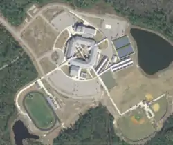 The land for Bartram Trail High School was purchased in January 1999[51] and was constructed by Arcadis.[6] The Bartram Trail High School campus takes up one hundred and twenty acres of land and the school building takes up 190,000 square feet (18,000 m2).[6] The school building is a two-story octagon with an open-air courtyard in the center. The cafeteria and media center are located within the main building, while the gymnasium and auditorium with a stage are attached on the south and north sides, respectively.[51] The outside of the campus has walkways, student, faculty and visitor parking, a parent drop-off section, a bus loop, a football and track stadium, a baseball and softball field, tennis courts, general-use play fields, a stormwater treatment facility, water and sewer utilities and a wetland mitigation area.[6]