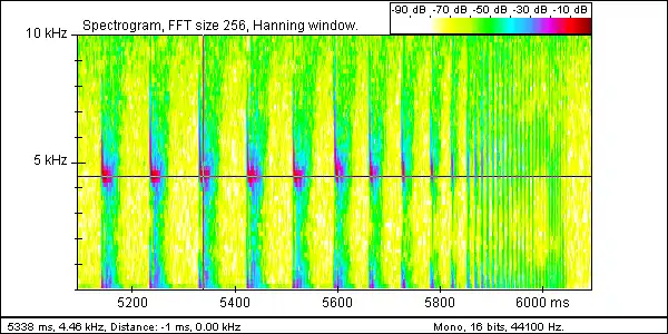 We can measure the end frequency (selected) which comes out as 44.6 kHz after multiplying by 10. The call rate speeds up as a food target is approached ending in a very rapid "feeding buzz". Note that the call becomes FM only during the feeding buzz.