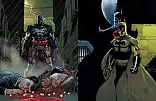 Despite this, Thomas is later revealed to have survived the attack, appearing in the main timeline in an alliance with Bane; he was first shown appearing alongside the other villains in Arkham Asylum after the failed wedding between Catwoman and his son.[20] His stated goal was to break his son's will as Batman, through methods such as psychically convincing Catwoman to end her relationship with Bruce, so that Bruce would abandon his life as Batman as Thomas wished. Once he judged Bruce to be suitably psychologically broken, he broke into the Batcave, knocked out Alfred, and trapped his son in a nightmarish sequence in Arkham Asylum. Once Bruce escaped, Thomas met him directly with the offer of restoring Martha to life so that they could be a family again, but Bruce rejected this offer, proclaiming that his father failed to understand that his goal as Batman was to hope for the future.[21] Returning to Gotham after apparently defeating his son, Thomas set out to reconstruct the city in his image, using the Psycho-Pirate to convert the city's villains into his enforcers, but Alfred- who Thomas had left mentally free but imprisoned at Wayne Manor as an apparent hostage to prevent retaliation from Batman's allies- informed Thomas that his son was going to destroy him when he finally returned to Gotham.[22] Thomas maintains control using Gotham Girl as his enforcer and the Psycho-Pirate to moderate the villains, issuing orders that any heroes entering Gotham will be expelled while villains would be contained, to the point that Gotham Girl is able to defeat Captain Atom when he tries to confront her.[23]