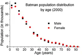 The population of the province is rapidly growing as a result of the inflow of workforce to the capital. Between 1990 and 2000, its population was rising at a rate of 5% per year. The population was stable in Beşiri and Gercüş, increasing by 1% per year in Kozluk and Sason and decreasing by 3% per year in Hasankeyf.[21] The total population was 608,659 in 2019 with 460,955 people living in the urban areas, mostly in the capital. It was 49.8% female.[22]