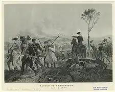 When the fighting broke out around 3:00 PM the German position was immediately surrounded by gunfire, which Stark described as "the hottest engagement I have ever witnessed, resembling a continual clap of thunder."[32] The Loyalists and Indian positions were overrun, causing many of them to flee or surrender. This left Baum and his Brunswick dragoons trapped alone on the high ground. The Germans fought valiantly even after running low on powder and the destruction of their ammunition wagon. In desperation the dragoons led a sabre charge in an attempt to break through the enveloping forces. The charge failed horrendously, resulting in massive German casualties and gaining no ground on the rebels. Baum was mortally wounded in this final charge, and the remaining Germans surrendered.[31]