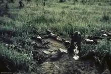 The Australians continued to patrol aggressively, with further clashes occurring between companies from 1 RAR and 3 RAR, and the North Vietnamese. On the morning of 30 May, C Company, 1 RAR under Major Ian Campbell had patrolled into a bunker system 3 kilometres (1.9 mi) east of FSB Coral and was contacted by a large dug-in North Vietnamese force.[97] At 08:30 the lead platoon, 9 Platoon, came under fire and was pinned down by RPGs and 7.62 mm RPD light machine-guns. Meanwhile, 7 Platoon moved to assist but was also pinned down, with one section suffering heavy casualties and losing an M60 machine-gun. Campbell struggled to establish a company defensive position, pushing 8 Platoon forward covered by armed helicopters and indirect fire. Yet with the two forces facing each other at only 10 to 15 metres (11 to 16 yd), the Australian artillery and mortars were rendered ineffective and Dunstan subsequently dispatched two tanks from Coral to reinforce them as heavy fighting developed.[112] Supported by APCs, the Australian infantry and tanks then assaulted and cleared several bunkers, allowing the lead platoon to withdraw after three hours of fighting. Suffering one killed and seven wounded, C Company broke contact by 11:55, withdrawing 500 metres (550 yd) as artillery, mortars and air strikes engaged the bunker system.[113] Three days later C Company returned to the area to recover the lost machine-gun only to find the position as they had left it; strewn with dead bodies and caved-in bunkers with the battlefield having been abandoned by the North Vietnamese, who had also withdrawn following the Australian assault. The tanks had destroyed at least eight bunkers, while North Vietnamese casualties included 24 dead and a further eight believed killed. Another group of 13 had also been engaged in the open by artillery, and were also possibly killed.[114]