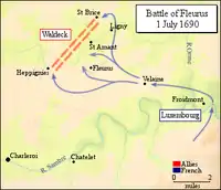 The Battle of Fleurus, fought on 1 July 1690, was a major engagement of the Nine Years' War. In a bold and masterful envelopment, Marshal Luxembourg, commanding a French army of some 35,000 men, inflicted a severe defeat on Prince Waldeck’s Allied force of approximately 38,000 men.[1] Waldeck lost 50% of his army and Luxembourg moved ahead to control Flanders.[2]