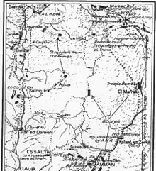 By 26 September the Fourth Army's garrison at Amman (less the rearguard captured at Amman) had not been "heavily engaged,"[8] and "was still intact as a fighting force even though it was in rapid retreat" north along the Hejaz railway and Pilgrims Road, many miles to the east of the Jordan River towards Damascus.[9]