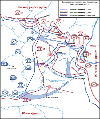 At dawn on 7 August, XIV and XXIV Panzer Corps shredded the Soviet front line near Kalach from the north and the south, all the while receiving immense support from Fiebig's air corps and parts of Pflugbeil's. From the northeast and southwest, tight against the Don River, XIV and XXIV Panzer Corps struck into the Kalach bridgehead. Their spearheads made contact southwest of Kalach by late afternoon, trapping the main body (eight rifle divisions)[14] of the Soviet 62nd Army in an encirclement. Joined by LI Army Corps the Germans began systematically destroying the surrounded Soviet forces. The pocket was wiped out in four days, by 11 August. Nearly 50,000 prisoners were taken, and the Germans claimed the destruction of a thousand Soviet tanks and 750 guns,[15] although the claims of destroyed Soviet tanks are considered a little exaggerated.[16] These losses threw the Soviet leader Josef Stalin into a panic and compelled him to feed more reserves into the fight at Stalingrad.