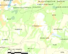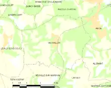 The ground down to the forests of Pinon and Rosay, which covered most of the uneven plain south of the marshes around the Ailette, comprised numerous ravines which in places were still wooded. The sides of the ravines wound around, facing all directions and could not be swept from end to end by artillery-fire. On the western flank, the Vauxaillon valley ran along most of the western and eastern slopes of the ridge and plateau above Laffaux. The Mont des Singes Spur was to its east and the Vauxaillon valley, which narrowed to the Allemant ravine, went round and then northwards, joining a ravine which curved round the Allemant plateau west of Pinon. The Allemant plateau was cut from south to north by the narrow St. Guillain ravine and other ravines lay below the crest of the Chemin-des-Dames ridge. From Vaudesson a ravine descended northwards to the west of Chavignon, where it met the western of two gullies, at the head of which was Malmaison Farm; Fort de la Malmaison was on the plateau above the eastern gully. The plateau was separated from the Filain and Pargny-Filain area, on the east of the French attack front, by a valley into which the eastern or Bois de la Garenne gully opened, just south of Chavignon.[27]