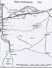 The British then established garrisons along their supply lines, which stretched across the Sinai from the Suez Canal. Patrols and reconnaissances were regularly carried out to protect the advance of the railway and water pipeline, built by the Egyptian Labour Corps.[7] These supply lines were marked by railway stations and sidings, airfields, signal installations and standing camps where troops could be accommodated in tents and huts. At this time the Egyptian Expeditionary Force (EEF) had a ration strength of 156,000 soldiers, plus 13,000 Egyptian labourers.[8]