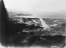Milne Bay is a sheltered 97-square-mile (250 km2) bay at the eastern tip of the Territory of Papua (now part of Papua New Guinea). It is 22 miles (35 km) long and 10 miles (16 km) wide, and is deep enough for large ships to enter. The coastal area is flat with good aerial approaches, and therefore suitable for airstrips, although it is intercut by many tributaries of rivers and mangrove swamps. Owing to the swampy lands and high rainfall, about 200 inches (5,100 mm) per year, the area is prone to malaria and flooding.[5] After floods, the coastal plains become "virtually impassable quagmires of glutinous mud",[7] and the ground is not suited for development. The bay is bounded to its north and south by the Stirling Ranges, which at points rise to 3,000–5,000 feet (910–1,520 m) and are covered in Kunai grass and dense scrubland.[7][8] The main area of firm ground suitable for construction and development is found directly at the head of the bay. In 1942 this area was occupied by plantations of palm oil, coconuts and cocoa,[9] as well as a number of jetties and villages, connected by what was described by Major Sydney Elliott-Smith of the Australian New Guinea Administrative Unit (ANGAU) as a "modest 'road' system"[5] that was, in actuality, only a dirt track 10–12 metres (33–39 ft) wide.[8][10] The area was sparsely populated, although there were a number of villages along the track. Ahioma was situated the farthest east, and together with Gili Gili in the west, it bounded Lilihoa, Waga Waga, Goroni, KB Mission, Rabi and Kilarbo.[11][12]
