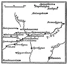 Archduke Charles stopped long enough at Pforzheim to transfer his military stores to the army's wagon train. Moreau was surprised by his foe's decision to disengage and took several days to digest this information. The French commander planned to attack Pforzheim on 15 July, but by that date Charles was retreating farther to the east.[10] On 21 July, there was a skirmish at Cannstatt near Stuttgart. There were 8,000 Austrians in nine battalions and eight squadrons involved in the clash.[11] From Cannstatt, Charles retreated toward Schwäbisch Gmünd with Moreau following his enemies at a leisurely pace. Meanwhile, the isolated Austrian left wing withdrew through Villingen[9] with Ferino in pursuit. The Swabians and Bavarian began negotiations with the French to quit the war while the Saxons marched away to the north to join Wartensleben's army. When Charles left the banks of the Rhine he left behind 30,000 troops in garrisons at Mannheim, Philippsburg, Mainz, Königstein im Taunus and Ehrenbreitstein Fortress.[12] On 29 July at Biberach an der Riss, the Swabian Regional Contingent was disarmed by Fröhlich on the instructions of Charles.[6] These subtractions left Charles with only three-quarters of the strength of Moreau. On 2 August, Moreau's troops bumped into the Austrians at Geislingen an der Steige and for a week afterward there was constant skirmishing with Charles' rear guard.[12] Saint-Cyr occupied the city of Ulm on 8 August 1796. Two days later, Charles was joined by his left wing.[13] At this time Ferino was at Memmingen to the south of the Danube.[12]