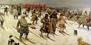 The Russian historian A. Lobin tried to calculate the size of the Muscovite army at Orsha based on the mobilisation capacities of the towns which had to send townspeople for military service.[11] It is known that except for Boyar sons of the sovereign's regiment, the army consisted of people from at least 14 towns: Novgorod, Pskov, Velikie Luki, Kostroma, Murom, Borovsk, Tver, Volok, Roslavl, Vyazma, Pereyaslavl, Kolomna, Yaroslavl, and Starodub.[12] Based on figures from the well-documented Polotsk campaign of 1563, the author gives the following estimates: 400–500 Tatars, 200 boyar sons of the sovereign's regiment, 3,000 Novgorodian and Pskovians, and about 3,600 representatives of other towns, altogether about 7,200 noblemen. Once servants are included, the overall size of the Muscovite army could be 13,000-15,000 men. Considering the losses during the campaign, the level of desertion which is documented in the sources and the number of soldiers left as a garrison in Smolensk; the number of Muscovite troops present at Orsha could have been as low as about 12,000 men.[5] This calculation method has been backed by Brian Davies (University of Texas at San Antonio, USA),[13] and Russian historians N. Smirnov, A. Pankov, O. Kurbatov,[14] М. Krom,[15] and V. Penskoy.[16]