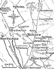 In the XIV Corps area, the 4th Division attacked with one brigade on an 800 yd (730 m) front. The limited progress of the XVIII Corps attack to the south restricted the advance to just beyond Poelcappelle and a new line was consolidated beyond the Poelcappelle–Houthoulst road.[44] On the left flank to the north, the final objective of the 29th Division was 1,650 yd (1,510 m) forward on the right and 2,500 yd (1.4 mi; 2.3 km) on the left. The attacking troops had moved up the night before in torrential rain, the Newfoundland Battalion on the left flank, taking 4 1⁄2 hours, to travel 6 mi (9.7 km) to the front line. The advance was made in three stages, with an hour to consolidate behind standing and smoke barrages at the first and intermediate objectives. The rain stopped at midnight and the attack began at 5:20 a.m. On the right, German machine-guns at Olga Farm caused many casualties and a delay but the first objective was reached on time. The surviving troops advanced on Condé House by rushes from shell-holes and took 200 prisoners when they reached it.[45]