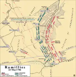 Marlborough, however, noticed several important weaknesses in the French dispositions.[33] Tactically, it was imperative for Villeroi to occupy Taviers on his right and Autre-Eglise on his left, but by adopting this posture he had been forced to over-extend his forces.[34] Moreover, this disposition – concave in relation to the Allied army – gave Marlborough the opportunity to form a more compact line, drawn up in a shorter front between the 'horns' of the French crescent; when the Allied blow came it would be more concentrated and carry more weight. Additionally, the Duke's disposition facilitated the transfer of troops across his front far more easily than his foe, a tactical advantage that would grow in importance as the events of the afternoon unfolded.[34] Although Villeroi had the option of enveloping the flanks of the Allied army as they deployed on the plateau of Jandrenouille – threatening to encircle their army – the Duke correctly gauged that the characteristically cautious French commander was intent on a defensive battle along the ridge-line.[35]