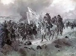 The initial clash favoured the Dutch and Danish squadrons. The disparity of numbers – exacerbated by Villeroi stripping their ranks of infantry to reinforce his left flank – enabled Overkirk's cavalry to throw the first line of French horse back in some disorder towards their second-line squadrons. This line also came under severe pressure and, in turn, was forced back to their third-line of cavalry and the few battalions still remaining on the plain.[52] But these French horsemen were amongst the best in Louis XIV's army – the Maison du Roi,[53] supported by four elite squadrons of Bavarian Cuirassiers. Ably led by de Guiscard, the French cavalry rallied, thrusting back the Allied squadrons in successful local counterattacks.[54] On Overkirk's right flank, close to Ramillies, ten of his squadrons suddenly broke ranks and were scattered, riding headlong to the rear to recover their order, leaving the left flank of the Allied assault on Ramillies dangerously exposed. Notwithstanding the lack of infantry support, de Guiscard threw his cavalry forward in an attempt to split the Allied army in two.