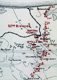 The 52nd (Lowland) Division developed a strong defensive position at Romani which had its left flank on the Mediterranean Sea, here a series of redoubts were built running southwards from Mahamdiyah along the line of high sand hills about 7 miles (11 km) to a dune known as Katib Gannit 100 feet (30 m) high. This line of sand hills, which were high enough to see Katia oasis from, marked the eastern edge of an area of very soft and shifting sand beyond which were lower dunes and harder sand where movement by both infantry and mounted forces was considerably easier. Between the shore at the western end of the Bardawil Lagoon and Katib Gannit (the principal tactical point on the eastern slopes of the Romani heights), the infantry constructed a line of 12 redoubts about 750 yards (690 m) apart, with a second series of redoubts covering the Romani railway station and the right of the defensive position which curved like a hook westward, then northward. A total of 18 redoubts were constructed, which when fully garrisoned held from 40 to 170 rifles each, with Lewis guns and an average of two Vickers machine guns allotted to each position; they were well wired on the right side of each of the positions, although there was no wire between the redoubts.[46] This defensive line was supported by artillery.[47][48]