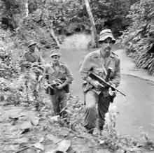3 RAR completed its tour in August 1965 and returned to Camp Terendak, being relieved in West Brigade by the 2/10th Gurkhas.[35] During its four months in Borneo the Australian battalion had suffered three men killed and five wounded, the bulk of which occurred during two separate land mine incidents.[36] The 2/10th Gurkhas subsequently fought a number of heavy engagements against the Indonesians, including an action at Bau on 21 November 1965, during which 24 Indonesians were killed for the loss of three Gurkhas. One of the Gurkhas, Lance Corporal Rambahadur Limbu, was later awarded the Victoria Cross; the only such decoration of the conflict.[37] Meanwhile, the 4th Battalion, Royal Australian Regiment (4 RAR) arrived in Malaysia in September 1965 to replace 3 RAR in the FESR, with the battalion returning to Australia in October. After a period of training the new battalion deployed to Sarawak in April 1966 where it also operated from a series of company bases around Bau. However, by this time the war was winding down as peace negotiations had begun between Malaysia and Indonesia, and although 4 RAR was involved in a number of contacts, its tour was less eventful.[38][39]