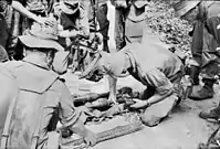With their defences alerted, the Americans and Australians "stood to" for the next 45 minutes.[2] The battle began at 01:45 with a heavy barrage of Viet Cong mortar and small arms fire. The Americans responded with small arms, machine-guns, tank fire, mortars and artillery and over the next hour the firing grew in intensity until, at 03:00, the Viet Cong switched their fires to the north-west side of the American perimeter, augmenting their barrage with recoilless rifles. Glotzbach expected a full-scale ground assault, but the Viet Cong had been held back by the weight of American firepower, with heavy artillery including 8-inch (200 mm) and 175-millimetre (6.9 in) howitzers firing in support from Phuoc Vinh, in addition to the defenders' own artillery, which was now firing over open sights after lowering their tubes to fire directly at the Viet Cong positions.[2] In total eight field batteries were available.[16] Elsewhere, the Australian standing patrol had remained in position despite the proximity of the Viet Cong, and with the Americans pouring massive fire into the area they were soon caught in the crossfire. Brunalli was subsequently wounded in the arm.[14]