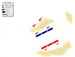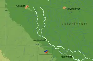 The Sassanid commander, Andarzaghar, deployed in the centre of this plain, facing south-east, with the western ridge behind them, and their left resting on the northeastern ridge. Khalid formed his army facing the Sassanid army. The center of the battlefield was about two miles southeast of present, Ain-ul-Muhari, 35 miles southeast of present, Najaf, and six miles southeast of present Ash Sinafiyah.[2] The Sassanid cavalry was heavily outnumbered by the Muslim cavalry. It was mainly composed of heavy cavalry and was stationed behind the wings, guarding the flanks. Khalid had 5,000 cavalry and 10,000 infantry with him. Knowing that his cavalry outnumbered the Persian cavalry, he designed his grand manoeuvre. His plan was the total encirclement of the Persian army using his superior cavalry. Rather than launching his cavalry via the flanks (as Hannibal had done in the Battle of Cannae), Khalid made use of the terrain, and positioned a part of the cavalry behind the western ridge of the battlefield. Khalid divided his cavalry into two regiments of about 2,000 men each, sending them behind the western ridge the night before the battle. They were instructed to attack the Persian rear at Khalid’s signal.