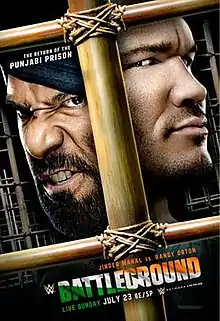 At Money in the Bank, Jinder Mahal defeated Randy Orton to retain the WWE Championship.[6] On the following episode of SmackDown, Orton explained in a sit-down interview that he lost focus after The Singh Brothers (Samir and Sunil Singh) attempted to attack his father, "Cowboy" Bob Orton, who was seated at ringside for the match. He said that he understood having allies, referencing his time in Evolution, The Legacy, and The Authority, but he would not tolerate people disrespecting his family. He said that he was no longer concerned with becoming a fourteen-time world champion; he only wanted to hurt Mahal. Later that night after Mahal defeated Luke Harper, Orton attacked The Singh Brothers, and then Mahal, who escaped into the crowd.[7] The following week, Orton said that he wanted a rematch for the title and that if he did not receive it, he would continue to attack Mahal anywhere he saw him. Commissioner Shane McMahon, who sympathized with Orton over Mahal and The Singh Brothers disrespecting his family, gave Orton a title rematch at Battleground, but allowed Mahal to choose the stipulation. Mahal chose a Punjabi Prison match, made famous by The Great Khali, marking the third Punjabi Prison match in WWE history and the first since 2007.[8] On the July 4 episode, Orton said that he would punish Mahal in the Punjabi Prison.[9] Mahal responded and said that he would be bringing the Punjabi Prison to SmackDown the following week.[10] That episode, while inside of the Punjabi Prison, The Singh Brothers explained the rules of the match while Mahal said that there would be no escape for Orton. Orton then came out and said that since the two of them would be locked in the prison, Mahal would not be able to have help from The Singh Brothers, who were the reason why Mahal won the title and subsequently retained it beforehand.[11]