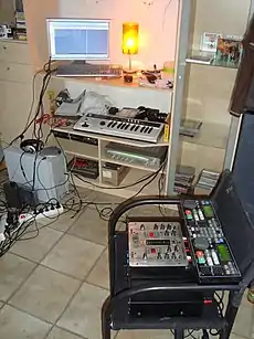 A bedroom producer is an amateur musician such as Stephen Hollis who creates, performs, and records their music independently using a home studio, often considered a hobbyist opposed to a professional record producer in the recording industry that works in a traditional studio with clients. Typically bedroom producers use accessible digital technology that costs less than the equipment in a professional studio, such as MIDI controller-based instruments and virtual studio technology (software synthesized instruments and digital effects), to create music for release to the world.[1] While a professional record producer oversees and guides the recording process, often working alongside multiple people such as studio musicians, singers, engineers, mixers, songwriters, arrangers, and orchestrators, a bedroom producer does everything independently: creating the ideas, recording them and processing them for release.[2] Bedroom producers are often self-taught, learning sound design, mixing and music theory by reading music production blogs and watching tutorials on the internet.[3] As bedroom producers depend on the accessibility of music technology, bedroom production has been made easier with advances in home computing power and digital audio workstations (DAW).[4]