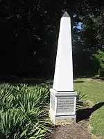 Peale cultivated, and frequently used as inspiration, extensive gardens on the estate grounds. One of the first structures Peale added to his garden was a "summer house", built in about 1813 by his son Franklin. It was a hexagonal structure with six columns, and a bust of George Washington crowning its roof.[15] The Wister family later built a gazebo on this site that as of 2014 is in a ruined state. Northwest of the summer house was an obelisk at the end of a garden walk. Peale painted four mottos that governed his life on the base of this obelisk, one on each side. It was Peale's wish to have been buried at the foot of this obelisk, yet it was not to be, as Peale sold Belfield a year before his death.[16] Though Peale was not buried at this location, the Wister family later buried their dog, a white German Spitz named 'Kaiser', there.[17] A reproduction of this obelisk was created by La Salle alumni in 2000.[18]