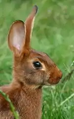 The Belgian Hare is not a true hare but rather a "fancy" (i.e., non-utilitarian) breed of domestic rabbit that has been selectively bred to resemble the wild hare.[1] Averaging 6–9 pounds (2.7–4.1 kg), the Belgian Hare is known for its slender and wiry frame and its long and powerful legs.