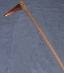 As well as exporting raw copper/bronze, there were some technical and cultural developments in Ireland that had an important impact on other areas of Europe. Irish food vessels were adopted in northern Britain around 2200 BC and this roughly coincides with a decline in the use of beakers in Britain.[67] The 'bronze halberd' (not to be confused with the medieval halberd) was a weapon in use in Ireland from around 2400–2000 BC.[67] They are essentially broad blades that were mounted horizontally on a meter long handle, giving greater reach and impact than any known contemporary weapon.[95] They were subsequently widely adopted in other parts of Europe,[96] possibly showing a change in the technology of warfare.[97]