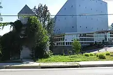 The church is dwarfed by a modern church constructed adjacent to the building and the historical building is kept in poor condition with overgrowth covering the entrance.