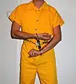 Inmate in belly chain with the arms cuffed parallel at the side