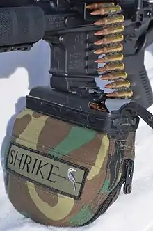 Flexible belts tend to hang downwards with gravity and randomly whip around with recoil during continuous firing, which can sometimes kink/twist and cause feeding malfunctions. Free-hanging belts can also get dirty/messy with exposure to the elements, be clumsy to handle, and entangle to other objects especially when the shooter tries to manuveur around. To minimize such issues, ammunition belts are sometimes carried in container devices designed to be attached to the firearm either by inserting like a drum magazine or just conveniently mounting to the side (for larger weapon systems). When loading ammunition, one end of the belt is pulled out of an opening on the container and inserted into the gun normally, and the belt progresses out of the container in a controlled fashion. These containers also often have a supporting/guiding bar which enables the belt to enter the weapon at an optimal (more perpendicular) angle, rather than bending down more acutely.