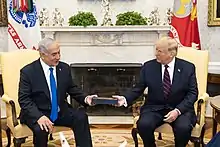 Netanyahu returned to the leadership of Likud in December 2005 after Sharon stepped down to form a new party, Kadima.[11] Although Likud finished second in the 2009 election to Kadima, Netanyahu was able to form a coalition government with other right-wing parties and was sworn in as Prime Minister for a second time.[12][13][14] He went on to lead Likud to victory in the 2013 and 2015 elections.[15] After the April 2019 election resulted in no party being able to form a government, a second election in 2019 took place. In the September 2019 election, the centrist Blue and White party, led by Benny Gantz, emerged slightly ahead of Netanyahu's Likud; however, neither Netanyahu nor Gantz was able to form a government.[16] After continued political deadlock, this was resolved when Likud and Blue and White reached a coalition agreement following the 2020 Israeli legislative election. Under the terms of the agreement, the premiership would rotate between Netanyahu and Benny Gantz, in which Gantz was scheduled to succeed Netanyahu in November 2021.[17] In December 2020, the coalition collapsed with a new election scheduled for 2021. Netanyahu made his closeness to Donald Trump central to his political appeal in Israel from 2016.[18]