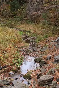 Near the culvert, Benson Hollow has a streambed made of gravel with an average grain size of 45 millimeters (1.8 in). The stream is a Rosgen C Type stream and does not have large loads of debris.[6] The surficial geology along the lower reaches of the stream, but alluvium and a lake occur in the upper reaches. The stream's valley is flanked by Wisconsinan Till and bedrock consisting of sandstone and shale.[5]