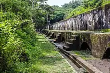 The pentagon-shaped Benteng Pendem covers a total of 10.5 hectares (26 acres), though 4 hectares (9.9 acres) have been used for the oil storage facilities. On site is an excavated moat, 500 metres (1,600 ft) long, 5 metres (16 ft) wide by 2–3 metres (6 ft 7 in–9 ft 10 in) deep. Originally, the moat had been 10 metres (33 ft) deep and surrounded the fortifications.[2] The tourist entrance on the eastern side of the fortress, built by the Cilacap government after opening it to the public, is located in what was originally the rear of the Benteng Pendem. Around the fortress there are 11 places where cannons were originally sited.[2]
