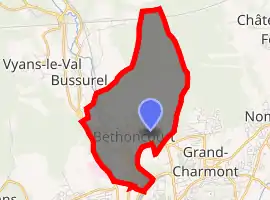 Bethoncourt lies north of Montbéliard, close to the border with the Haute-Saône department and the Territoire de Belfort and very near the Swiss border. The Lizaine, formerly called the Luzine, flows through it.