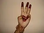 The gestures used in Bharatanatyam are called Hasta (or mudras). These symbols are of three types: asamyuta hastas (single hand gestures), samyuta hastas (two hand gestures) and nrtta hastas (dance hand gestures).[85] Like words in a glossary, these gestures are presented in the nritta as a list or embellishment to a prelim performance. In nritya stage of Bharatanatyam, these symbols set in a certain sequence become sentences with meaning, with emotions expressed through facial expressions and other aspects of abhinaya.[85]
