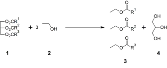 Triglycerides (1) are reacted with an alcohol such as ethanol (2) to give ethyl esters of fatty acids (3) and glycerol (4):