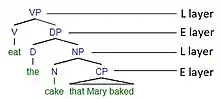 Due to these limitations in each system, where both lexical and expressive categories can only be one layer deep, the recursive and unbounded hierarchical structure of human language is surprising. The Integration hypothesis posits that it is the combination of these two types of layers that results in such a rich hierarchical structure. The alternation between L layers and E layers is what allows human language to reach an arbitrary depth of layers. For example, in the phrase "Eat the cake that Mary baked", the tree structure shows an alternation between L and E layers. This can easily be described by two phrase rules: (i) LP → L EP and (ii) EP → E LP. The recursion that is possible is plainly seen by transforming these phrase rules into bracket notation. The LP in (i) can be written as [L EP]. Then, adding an E layer to this LP to create an EP would result in [E [L EP]]. After, a more complex LP could be obtained by adding an L layer to the EP, resulting in [L [E [L EP]]]. This can continue forever and would result in the recognizable deep structures found in human language.[45]