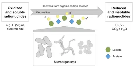 Direct enzymatic reduction is the change of radionuclides of a higher oxidation state to a lower one made by facultative and obligate anaerobes. The radioisotope interact with binding sites of metabolically active cells and is used as terminal electron acceptor in the electron transport chain where compounds such as ethyl lactate act as electron donors under anaerobic respiration.[4]