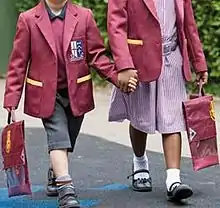 - Boys - maroon blazer with white shirt, maroon tie and grey trousers.