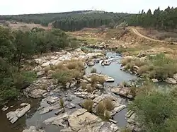 The ultimate source of the river is at over 2,000 m a.s.l. in the uplands north of Utrecht.[2] It flows between rolling uplands dotted with commercial plantations, passing under the Kruger Bridge of 1898, before reaching Pivaansbad south of Paulpietersburg, where hot springs and the Natal Spa resort are located. Downstream it enters open but hilly terrain until it enters the Bivane Dam, where the Bivane Dam resort and a nature reserve of 2,000 ha are located. Downstream of the dam the river enters more rugged terrain, and the turbulent waters are popular with canoeists, and besides for river rafting. This area is also the starting point for the annual Ithala Challenge Canoe Marathon.[3] The river has a confluence with the Pongola on the western boundary of the Ithala Game Reserve, not far from the border with Swaziland.