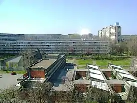 Bežanijski blokovi are built on the southernmost uninhabited area of the former Bežanija village, thus the name. However, it is completely urbanized and even though different architecturally from the southern section, it also features a series of residential skyscrapers in two parallel rows, stretching through the blocks 61, 62, 63 and the western section of 64. There are over 50 skyscrapers altogether (22 parallel ones with several additional in between).