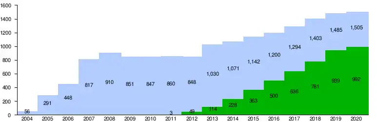 Dispatch reliability is an industry standard measure of the rate of departure from the gate with no more than 15 minutes delay due to technical issues.[170] The 787-8 started out with a ~96% operational reliability, increasing to ~98.5% in April 2015. Daily utilization increased from five hours in 2013 to twelve hours in 2014.[171] Dispatch reliability grew to 99.3% in 2017.[172]
